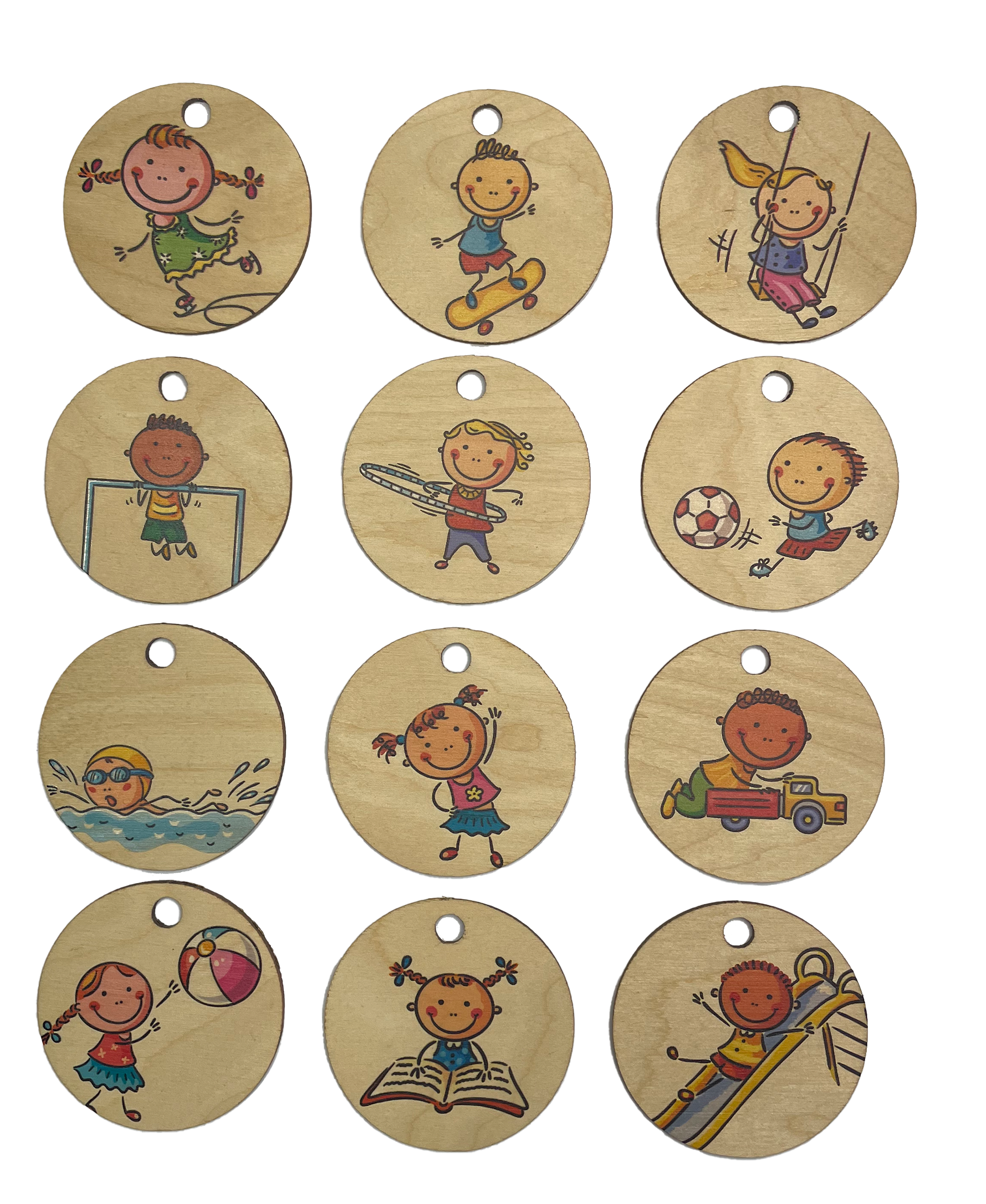 Die Karten beinhalten Tätigkeiten wie: Schlittschuhlaufen, Skateboard fahren, Schaukeln, Übungen am Reck, Hula Hopp, Fussball, Schwimmen, Gymnastik, freies Spielen, Ball Sportarten, Lesen/Vorlesen, Rutschen/Spielplatz.