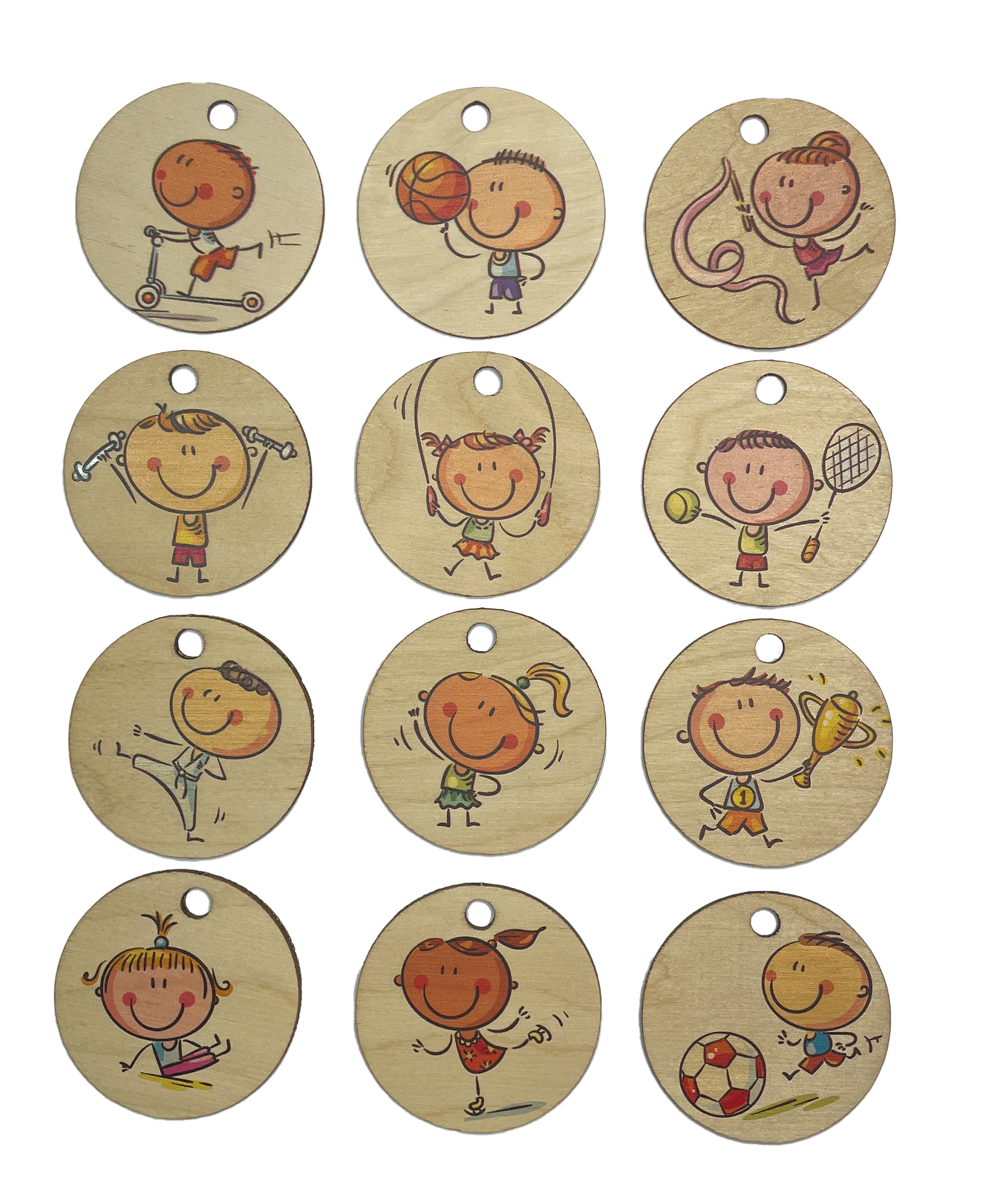 Die Karten beinhalten Tätigkeiten wie: Roller fahren, Basketball spielen, Rhythmische Sportgymnastik, Hanteln heben / Kraftsport, Teilchen Hüpfen / Ausdauersport, Tennis, Judo, Gymnastik, Wettkampf / Laufen, Joga, Schlittschuh laufen, Fußball spielen.